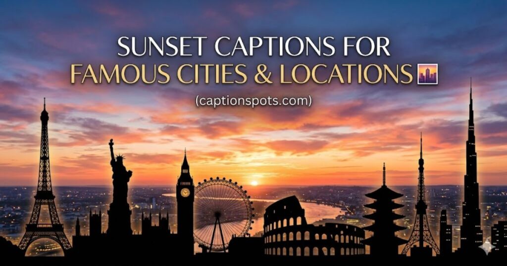 Every city has its own version of the sunset — shaped by its skyline, its geography, and its particular light. These sunset captions for famous cities and locations capture the specific, irreplaceable quality of watching the sky change in the world’s most iconic places.